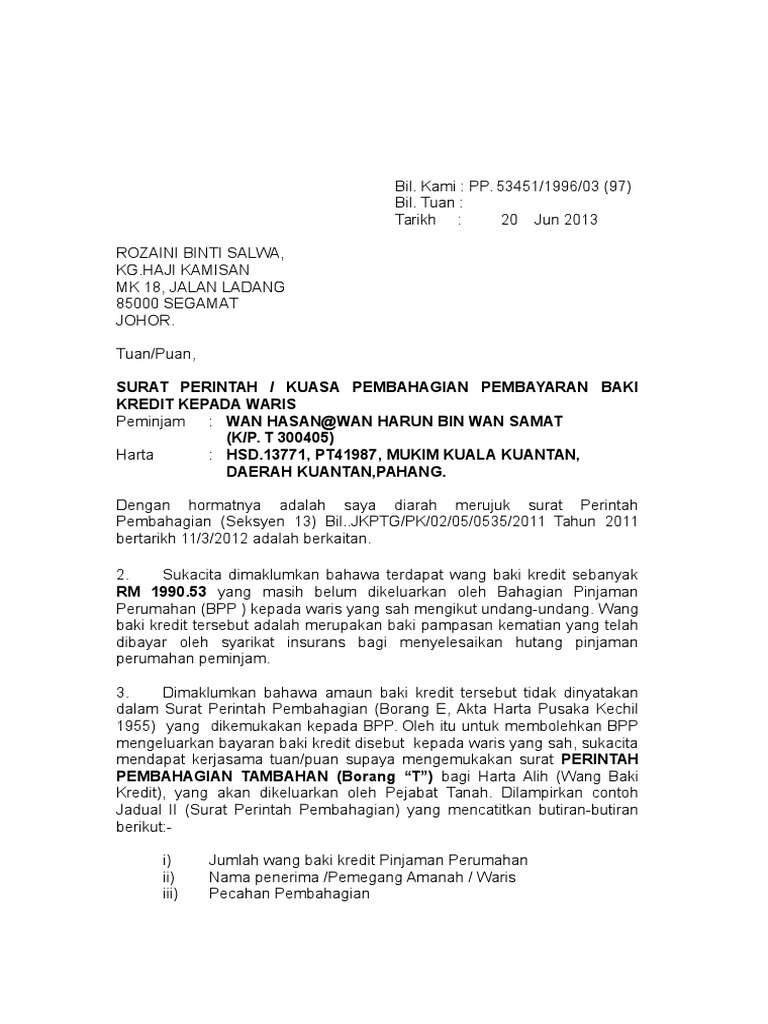 Pentadbiran Harta Pusaka Jbg Gov My Pentadbiran Harta Pusaka Jbg Gov My Pdf Pdf4pro from pdf4pro.com Para ahli waris dengan ini sepakat untuk melakukan pembagian harta warisan diantara para ahli waris atas harta kekayaan peninggalan pewaris yang berupa: Mengatasi penyakit maag, surat keterangan pembagian harta warisan. Mewasiatkan lebih dari sepertiga harta pusaka. Menghibahkan harta kepada sebagian anak sebelum orang tua meninggal. Jalan tarakan 32 lateng, banyuwangi. Poin kedua adalah menyebutkan kepada siapa surat tersebut ditujukan. Kali ini, saya akan berbagi contoh surat perjanjian pembagian harta bersama atau gono gini. Biasanya tempat dan tanggal surat ini terletak pada bagian sudut kanan atas surat pribadi.