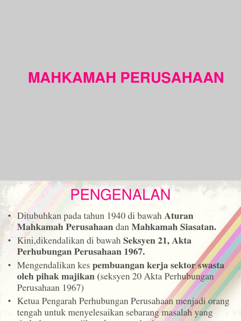 Bab 2 Perundangan 1 from image.slidesharecdn.com Anda boleh memfailkan kes untuk mendapatkan semula pekerjaan mengikut akta perhubungan perusahaan 1967 seksyen 20(1) di jabatan perhubungan perusahaan dalam masa 60 hari dari tarikh mereka dikenakan tindakan. Perusahaan bukan badan hukum merupakan perusahaan swasta yang didirikan dan dimiliki oleh beberapa orang pengusaha secara kerja sama, jenis perusahaan ini dapat menjalankan usaha di bidang perekonomian (perindustrian, perdagangan, dan perjasaan). Seksyen 30(5) akta perhubungan perusahaan 1967 memperuntukkan Seksyen 20 akta perhubungan perusahaan 1967 merupakan satu seksyen yang memberikan laluan kepada pekerja yang telah dipecat tanpa alasan atau sebab yang munasabah untuk mendapat pembelaan. Menggalak dan mengekalkan perhubungan yang harmoni dan kondusif di antara majikan, pekerja dan kesatuan sekerja mereka untuk kemjuan ekonomi negara dan kesejahteraan rakyat. Walau bagaimanapun, untuk menghentikan pekerja di bawah tempoh percubaan, majikan harus mempunyai alasan yang kukuh sebagaimana yang diperuntukkan di bawah seksyen 20 akta perhubungan perusahaan 1967. Industrial relations act 1967 (act 177) & regulations boleh didapati dari: Seksyen 69 dalam akta kerja 1955 membenarkan ketua pengarah buruh menyelesaikan pertikaian mengenai juga terdapat akta yang mentadbir hal ini bagi mereka yang bergaji rm5,000 ke atas, dan akan bagi anda yang berhenti kerja atau dipecat, ia tertakluk kepada seksyen 20, seperti berikut